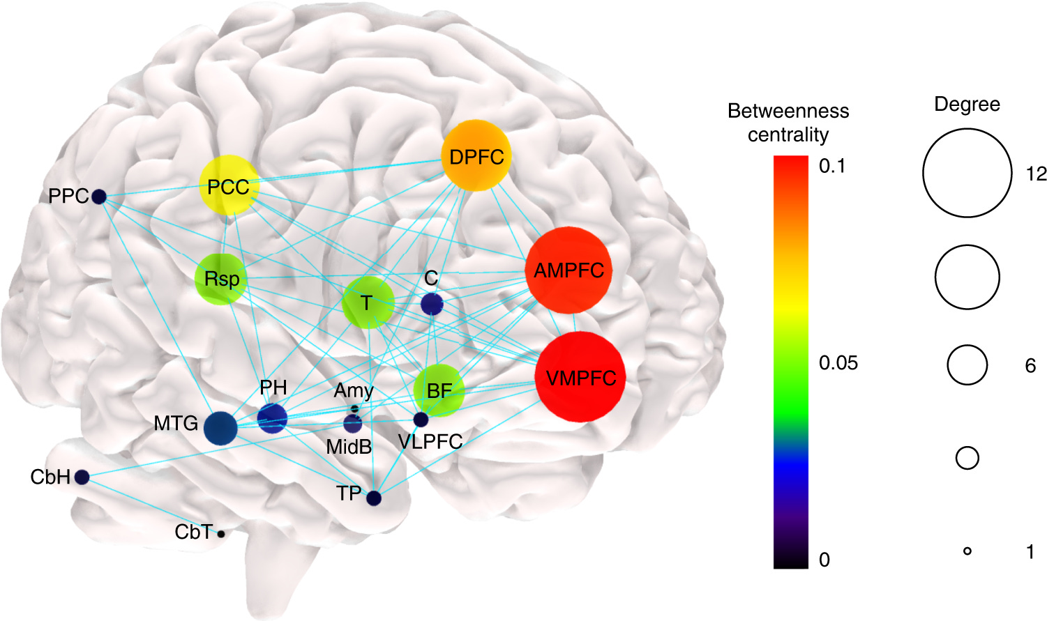 In other words, the AMPFC and the VLPFC are highly connected nodes which commonly feature on a particular shortest path between two brain regions. However, all of these nodes are important. When people talk about “DMN activity,” they are broadly referring to strong coupling among all of these regions when participants are in a resting-state.
